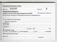 Die ersteren beiden werden postalisch per RSb (Rückscheinbrief) zugestellt, letztere in Form einer Quittung, dem eigentlichen Strafzettel. Sie können zwanglos per Zahlschein respektive direkt bar oder bargeldlos beglichen werden. Nur bei Überschreitung der Einzahlungsfrist oder Einspruch kommt es zu einem regulären Verwaltungsstrafverfahren mit Verhandlung – Einspruch ist nur bei der Strafverfügung möglich, gegen die anderen beiden Formen gibt es kein Rechtsmittel. Durch den Rahmenbeschluss 2005/214/JI bezüglich der gegenseitigen Anerkennung von Geldstrafen und Geldbußen[2] können Strafverfügungen prinzipiell EU-weit vollstreckt werden.[3]