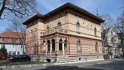 Das Gebäude steht auf der Liste der Kulturdenkmale in Weimar (Einzeldenkmale). Das Baujahr ist über einem Löwenkopftondo angebracht. Die zweigeschossige Villa hat durchgängig Rundbogenfenster. Bemerkenswert ist die Loggia mit dem darüber befindlichen Balkon. Die Ziegel sind verschiedenfarbig, was wiederum in die Ornamentgestaltung einbezogen wurde. Auch unter dem Dach wurde ein hervortretender Bogenfries zur Verzierung angebracht. Auch ihre Lage als Solitär gegenüber der katholischen Kirche macht sie zu etwas Besonderen.