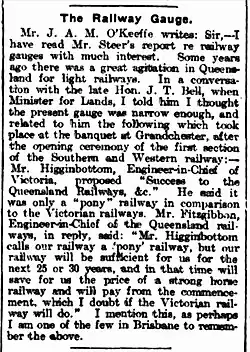 Nachdem der Engineer-in-chief der Victorian Railways Thomas Higinbotham bei einem Bankett die Queensland Railways verächtlich als Pony-Eisenbahn bezeichnet hatte, antwortete Abraham Fitzgibbon, dass diese Eisenbahn für die nächsten 25 oder 30 Jahre ausreichen werde, und in dieser Zeit die Investitionskosten für eine normalspurige Pferdeeisenbahn ersparen werde und sich so von Anfang an rentieren werde.[14] Tatsächlich wurde diese Spurweite in Queensland aber bis heute beibehalten.