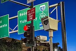 Kalifornische Ampel mit unten geschlossener Abschirmblende wegen des frühen und späten Sonnenstandes.