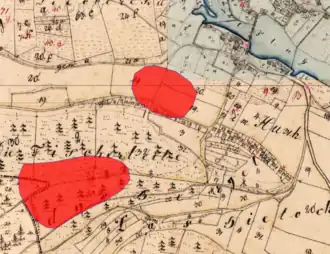![]() Lageplan von Abschnittsbefestigung Kottingwörth (links unten) und Siedlung der Bronze-, Urnenfelder-, Hallstatt- und Latènezeit (rechts Mitte) auf dem Urkataster von Bayern | ||