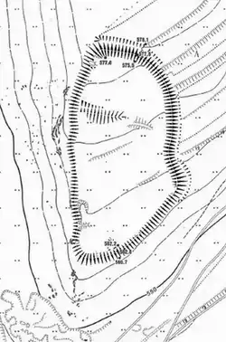 Auf einer leicht geneigten Höhenfläche umschließt ein Wall von 7–12 m Breite und teilweise 2 m Höhe eine Fläche von 145 × 70 m. Der nördlichen Schmalseite ist ein nur mehr schwach erkennbarer Graben vorgelegt. An den anderen Seiten folgt der Wall der oberen Steilhangkante. Im Südwesten ist ein schwach ausgeprägter Hanggraben vorhanden. Im Inneren des nördlichen Drittels finden sich noch geringfügige Mauerreste, das Gelände liegt öd.