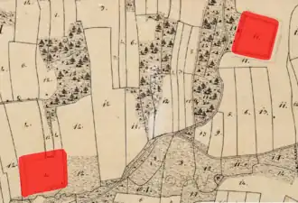 Lageplan der Abschnittsbefestigung Schanzenberg auf dem Urkataster von Bayern, rechts oben Abschnittsbefestigung Schanzenberg, links unten keltische Viereckschanze | ||