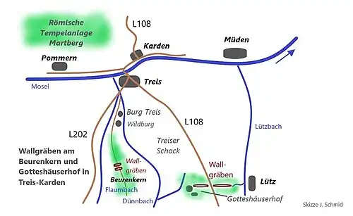 Treis-Karden und seine nahe Umgebung war in der Antike mit einem weit verzweigten und gut ausgebauten Wege- und Straßennetz in der Hunsrück-, Mosel- und Eifel-Region verbunden. Der Moselübergang bei Treis war Teil einer Querverbindung der wichtigen römischen Fernstraßen von der Moselmetropole Trier (Augusta Treverorum) über den Hunsrück nach Bingen und über die Eifel nach Andernach an den Rhein.[5] Von der ehemaligen „Ausoniusstraße“ auf dem Hunsrück führte bei Simmern eine Straße von Simmern abzweigend über Kastellaun (L108) in Richtung Mörsdorf im Hunsrück, wo über eine weitere Abzweigung die Verbindung über Lieg östlich vom Treiser Schock nach Treis führte. Der direkte Weg über Mörsdorf führte auf der westlichen Seite des Beurenrings vorbei an der ehemaligen keltischen Wallburg hinunter ins Moseltal ins Mündungsgebiet des Flaum- und Dünnbachs. Nach Überquerung der Mosel führte der Weg über Karden durch die Eifel nach Kaisersesch zur Fernstraße von Trier nach Andernach. Über einen kleineren Zuweg war auf Kardener Seite die keltisch-römische Großsiedlung mit Tempelanlage (Lenus-Mars Heiligtum) auf dem Martberg von Pommern an dieses Wegenetz angeschlossen.[5] Reste einer römischen Gleisstraße wurden im Waldgebiet hinter Mörsdorf festgestellt. Hier sind noch in den Fels eingetiefte Spurrillen mit einer Spurbreite von 1,20 erkennbar. Diese Wegabzweigung führte hier ins Flaumbachtal zum heutigen Kloster Maria Engelport.[5] Auch auf dem aufsteigenden Feldweg aus Richtung Wildburg in Richtung Wallanlage am Beurenkern sind stellenweise im Fels eingetiefte Bereiche erkennbar, die auf eine römische Gleisstraße hindeuten könnten.