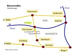 - ↑ a b c Axel von Berg: Mörsdorf: Römische Gleisstraße. In: Cochem-Zell. Landschaft an der Mosel. Führer zu archäologischen Denkmälern in Deutschland (=Archäologie an Mittelrhein und Mosel, Bd. 17), Stuttgart 2005, S. 147–148