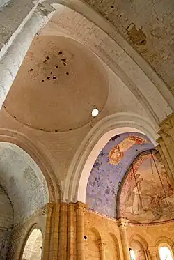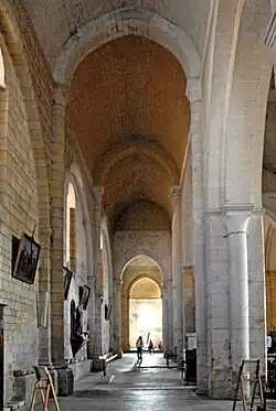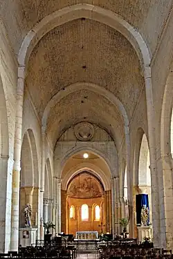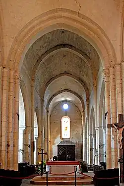 Das Mittelschiff wird von einem angespitzten Tonnengewölbe überdeckt, das zwischen den Jochen von ebenso angespitzten Gurtbögen unterstützt wird. Diese stehen auf halbrunden Säulen, die auch Dienste genannt werden, die von schlichten Kapitellen und profilierten Kämpfern bekrönt sind. Die Kämpfer befinden sich in Höhe der Bogenansätze, die zwischen den Kapitellen mit einer Art Zahnprofil markiert werden.