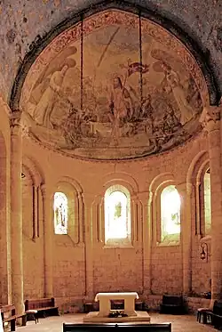 Die Apsisrundung wird vertikal in fünf Abschnitte unterteilt, die durch flache, einmal in der Höhe abgestufte Strebepfeiler getrennt werden. Sie reichen unmittelbar unter die Gesimsplatten. Jeweils in der Mitte der Wandabschnitte ist je ein schlankes rundbogiges Fenster ausgespart, dessen Scheitel etwa bis zur halben Wandhöhe hinaufreicht. Die beiden äußeren Fenster sind ausschließlich scharfkantig begrenzt und besitzen keine schmückenden Skulpturen. Die nächsten beiden Fenster sind mit je einer Archivolte eingerahmt die in Laibungsrücksprüngen eingestellt sind. Ihr wandbündiger Bogen besitzt einen quadratischen Querschnitt ohne Dekor. Er wird aber von einem Kragprofil überfangen, das mit sternförmigen Rosetten dekoriert ist. Der Bogen ruht auf Säulchen, die mit pflanzlich skulptierten Kapitellen, profilierten Kämpfern und Basen, auf kantigen Plinthen stehend, ausgerüstet sind. Die Fensterbank ist steil abgeschrägt. Das mittlere Fenster ist ähnlich ausgestattet, jedoch noch aufwendiger dekoriert. Die Stirnseite des Archivoltenbogens ist in zwei Rundstäbe mit skulptierten Begleitern aufgelöst. Die seitlichen äußeren Laibungskanten sind wie das Überfangprofil mit sternförmigen Rosetten dekoriert. Die Kapitelle sind figürlich und pflanzlich skulptiert.