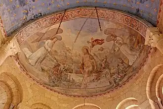 Die Gewölbe des Chors und ihr Gurtbogen sind verputzt und polychrom bemalt. Im Chorjoch wird ein blauer Himmelhintergrund gezeigt, auf dem sich ein Raster von goldenen „Fleur de Lys“ (königliche Lilie) abhebt. Inmitten des Gewölbes präsentieren zwei Engel ein Tuch mit einer lateinischen Inschrift, auf dem ein großes IHS prangt. Der trennende Gurtbogen ist mit pflanzlichem Dekor bemalt. Die Apsiskalotte zeigt einen paradiesischen Garten, in dem sich der lebendige Christus aus einem steinernen Sarkophag erhebt und sich dabei auf einen langen Stab stützt, der in einem Lazaruskreuz (auch Kleeblattkreuz) endet, an dem ein Wimpel befestigt ist. Auf dem Boden um den Sarg herum sitzen und liegen schlaftrunkene Wächter, mit Speeren und Rüstungen bewaffnet. Auf beiden Seiten dieser Szene steht je ein Engel, mit erhobenen Flügeln, einer schwenkt ein Räucherfass.