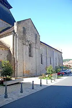 Die Fassade ist beeinflusst von denen der Saintonge, vor allem bezüglich ihrer dreifachen vertikalen und horizontalen Gliederung. Die vertikale entspricht der inneren Aufteilung in drei Schiffe und wird von vier wuchtigen Strebepfeilern übernommen, deren Kanten in große Rückversätze aufgelöst sind. Sie reichen bis knapp über die Scheitelhöhe der Fenster hinauf und sind oberseitig abgeschrägt. Der nördliche Pfeiler steht ein kurzes Stück eingerückt neben der Fassadenecke. Der südliche verschwindet hinter der dort angebauten Wand des Konventsgebäudes. Die horizontale Gliederung besteht aus der unteren Portalzone, der mittleren Fensterzone und der oberen Blendarkadenzone.