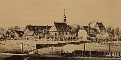 Abtei Fraulautern, Stich um 1865, im Vordergrund die neue Eisenbahnlinie an der Saar, links die Klostermühle, in der Mitte die barocke Klosterkirche, rechts der Torbau