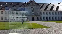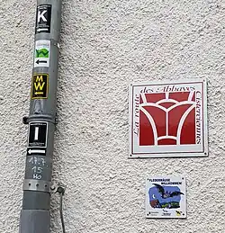 Am Pfortenhaus: „Route européenne des abbayes cisterciennes“, „Fledermäuse Willkommen“ (NABU) und die Wandermarkierungen (von oben nach unten): K des Westerwaldvereins (Kölner Weg, 252,3 km), [Westerwald-Steig], Marienwanderweg (20,2 km von Marienstatt nach Marienthal), I des Westerwaldvereins (121,6 km von Königswinter nach Herborn)