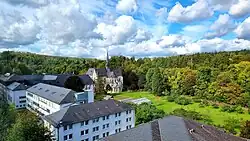 Das Klostertal mit Basilika in der Bildmitte, Schule und Gästehaus (Querbau im Vordergrund)
