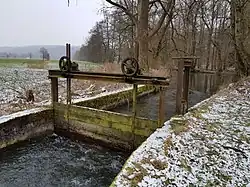An einem Wehr wird das Wasser der Nister abgeleitet