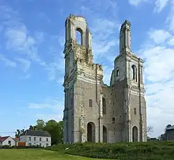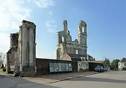 Von der Abteikirche steht heute nur noch ein Teil der Westfassade. Diese war ursprünglich 53 Meter hoch und umfasste fünf Etagen. Durch Artilleriebeschuss im Ersten Weltkrieg wurde die oberste Etage zerstört, heute kommt sie noch auf eine Höhe von 44 Metern. Die ersten beiden Etagen sind aus Sandstein, die anderen beiden Etagen aus Kreide errichtet. Das Gesims wurde 1990 restauriert.