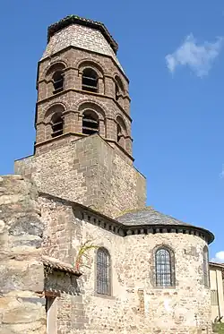 Der romanische Glockenturm beginnt mit einem flachen geschlossenen achteckigen Sockel in gleichem Umriss wie die Geschosse darüber. Er wird mit einem schmalen Kraggesims abgeschlossen. Die beiden folgenden Geschosse sind untereinander identisch. Auf jeder Achteckseite ist eine rundbogige Klangöffnung ausgespart. Sie wird von einer zweistufigen Arkade umgeben, deren innerer und äußerer Bogen auf profilierten Kämpferplatten steht. Der äußere Bogen ist aus doppelten Rundstäben zusammengesetzt. Beide Geschosse werden von flachen Kraggesimsen oberseitig abgeschlossen. Der Turm besteht aus rötlichem Gestein von La Chaumete.