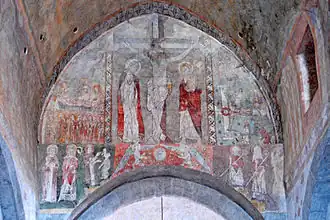 Auf der Wand über dem Triumphbogen der Vierung ist in der Mitte eine Kreuzigungsgruppe mit Christus am Kreuz, Maria und Johannes dem Täufer dargestellt. Am unteren Bildrand wird die Gruppe von Mönchen und Äbten begleitet, unter ihnen wahrscheinlich auch der heilige Robert, der Gründer der Abtei. Ein Mönch unten links wendet sich einer kleineren Person zu, der aus dem Mund ein undefinierbares Gebilde entströmt. Es könnte sich um eine Dämonenaustreibung handeln. Die Kreuzigung wird von kleineren Szenen flankiert, insbesondere links oben die Beisetzung der Jungfrau Maria, die von Aposteln umringt und von Gott empfangen wird, und rechts das Martyrium des heiligen Andreas, des Kirchenpatrons, der statt an dem gewohnten Andreaskreuz in X-Form an einem lateinischen Kreuz hingerichtet wird, das der Künstler horizontal aufstellte, mit dem Querbalken in die Erde gerammt. Drei Schergen binden auf Kommando eines vierten den Todgeweihten an Unterarmen und Unterschenkeln an das Kreuz. Unmittelbar unter der großen Kreuzigungsgruppe ist genau mittig eine helle runde Scheibe dargestellt. Dieser streben auf beiden Seiten zwei Engel mit weit gespreizten Flügeln entgegen und tragen etwas nicht Definierbares in den Händen.