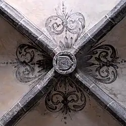 Lediglich das zweite und dritte Joch des Seitenschiffs werden von einem spitzbogigen Kreuzrippengewölbe mit kräftigen profilierten Rippen überdeckt. Die Joche werden durch kantige spitzbogige Gurtbögen getrennt. Die Schlusssteine sind mit Wappen geschmückt, die in den Zwickeln noch von gemalten Ornamenten umgeben sind. Im ersten Joch werden in einem Kreuzgratgewölbe durch Bemalung die Rippen vorgetäuscht.