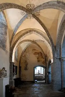 Die angespitzte Tonne des Mittelschiffs stammt wahrscheinlich erst vom Beginn des 14. Jahrhunderts, zu dem auch die Vergrößerung des Fassadenfensters mit angespitztem Bogen datiert wird. Der Zeitpunkt des Seitenschiffanbaus ist wegen seiner rohen nicht einheitlichen Architektur schwer zu bestimmen.[1] Das noch rundbogige Kreuzgratgewölbe im Joch 1 und die Fenster mit Rundbögen deuten noch auf die späte Romanik, hingegen die spitzbogigen Kreuzrippengewölbe in den Jochen 2 und 3 auf die frühe Gotik. Die Reste der ältesten Fresken im 3. Joch des Seitenschiffs werden auf das 11. Jahrhundert datiert. Das wiederum lässt annehmen, dass das Seitenschiff noch im selben Jahrhundert erbaut worden ist, vielleicht mit Kreuzgratgewölben in allen Jochen.