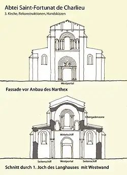 Die ehemalige Fassade von St-Fortunat wird heute von dem zweigeschossigen Narthex verdeckt, kann aber in dessen Innern geschossweise eingesehen werden (siehe auch Handskizze).