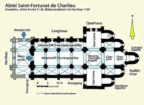 Die dritte Kirche von Charlieu entstand unter den Nachfolgern Abt Odilo (994–1049) und Abt Hugo (1049–1109), ein umfangreicherer Neubau, der 1094 durch Papst Urban II. geweiht werden konnte. Im Jahr 1130 wurde an die Westfassade des Neubaus ein offener zweigeschossiger Narthex angebaut, dessen Eingang sich geländebedingt nach Norden öffnete. Der Grundriss der dritten Kirche Saint-Fortunat ist direkt vergleichbar mit der nur etwa 25 Kilometer entfernten Prioratskirche der Ste-Trinité d’Anzy-le-Duc aus dem 11. Jahrhundert, was eine gemeinsame Planung nahelegt. Die dreischiffige Anlage mit vortretendem Querhaus und fünfteiligem Staffelchor ist ebenso von ihrer Mutterkirche in Autun übernommen worden, die sich an dem Vorbild der 1088 zerstörten Abteikirche Cluny II orientierte.
