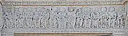 Im Architrav herrscht ein tumultartiges Durcheinander. Es sind die Umrisse einer größeren Menschenmenge, einige Haustiere und verkleinerte Architekturen, vielleicht von Altären, zu erkennen. Vermutlich sind hier alttestamentliche Opferszenen dargestellt.