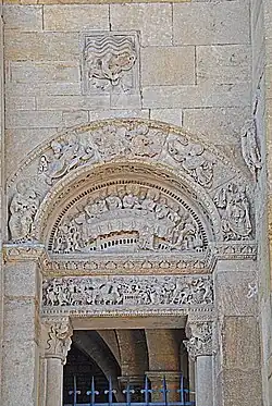 Die Portalöffnung über einer Brüstung wird flankiert von schmalen Wandstreifen, denen etwas zurückgesetzt halbrunde Säulen vorgeblendet sind. Diese sind mit pflanzlich und figürlich skulptierten Kapitellen und Kämpferplatten und profilierten Basen auf Plinthen ausgestattet. Auf ihnen liegt ein schlanker Architrav auf, der bis gegen die seitlichen Wandenden stößt. Über dem Relief des Architravs ist ein weit ausladendes Kragprofil mit abgeschrägte Vorderseite angebracht, das mit Blattfächern dekoriert ist. Es wird um die Wandstreifen herumgeführt. Auf den Wandenden steht ein scharfkantiger Archivoltenbogen, dessen Vorderseite mit fünf relativ großen Figuren skulptiert ist. Sie werden dem Thema der Verklärung des Herrn zugeordnet. Die Innenseite des Bogens ist mit geschwungenen Ranken dekoriert.