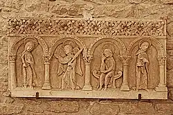 Auf dem Architrav sitzen in einer schlichten Blendarkatur zwölf Apostel, frontal zum Betrachter und halten in der Rechten je ein Buch und entbieten mit der ganz geöffneten und aufwärts gerichteten Linken einen Gruß.