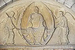 Gezeigt wird die Maiestas Domini („Herrlichkeit Gottes“) oder der thronende Christus in der Mandorla, die von zwei Engeln getragen wird. Der Thron wird als kostbar geschnitzte Sitzbank angedeutet, auf dem Jesus in wallendem Gewand sitzt, mit der Linken das Buch des Lebens auf den Knien abstützt und die Rechte zum Segensgestus emporhält. Sein Antlitz ist von einem Kreuznimbus hinterlegt. Die Engel stehen leicht vorgebeugt mit weit ausgebreiteten Flügeln, offensichtlich zum Flug bereit. Ihre Köpfe sind mit Nimben hinterlegt.