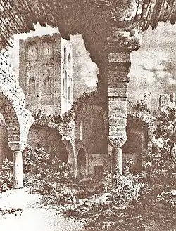 Ganz im Norden des Komplexes erhebt sich der im Grundriss nahezu quadratische Glockenturm wie ein italienischer Campanile, wo er sich am Ostende der Kirche an ihre nördliche Seitenwand anlehnt.[8] Das Mauerwerk des Turms besteht aus ähnlichem Steinmaterial wie das der Kirche. Im Erdgeschoss wird der Turm tunnelartig von einem breiten Durchgang von Osten nach Westen durchquert, der sich beidseitig mit rundbogigen Portalöffnungen erschließt, eine der ursprünglichen Pforten des Klosters. Es war ein alter Brauch, besonders in den karolingischen Klöstern, Türme den Erzengeln zu weihen und Pforten unter den Schutz dieser „Miliz“ des Himmels zu stellen. Im ersten Obergeschoss dieses Turms befindet sich eine Kapelle, die dem Erzengel Michael gewidmet war. Zu ihr gehört eine über dem östlichen Portal nur leicht vortretende Apsidiole, dem Chor dieser Kapelle. Auf der Westseite des Turms ist außermittig nach Süden versetzt ein großes rundbogiges Fenster ausgespart, das die Kapelle belichtet. In ihrem Innern finden sich heute noch Überreste alter Wandmalereien. Zur Treppe des Turms und zu dieser Kapelle gelangt man unmittelbar aus dem östlichen Joch des nördlichen Seitenschiffs.