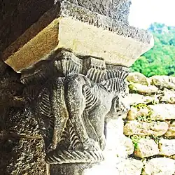 Im Obergeschoss des Kreuzgangs gibt es an der Südwand der Kirche die Überdachung der Geschosstreppe, deren hölzerner Pultdachstuhl auf einigen Kapitellen ruht. Eines davon zeigt die Darstellung von Sirenen mit gekrümmten Leibern und ein anderes mit aufrecht stehenden Adlern mit gespreizten Schwingen.