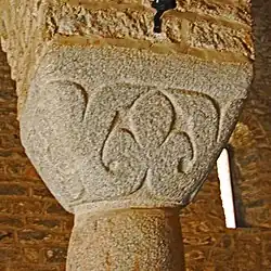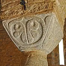Hier befindet sich dieser Dekor auf Granitkapitellen, die die Form umgedrehter, sich nach oben hin sich stark verbreiternder Pyramidenstümpfe haben, eine Gestaltungsweise, die man auch im Kreuzgang von Moissac findet. Die Dekors sind als Flachreliefs ausgebildet, das heißt, der Künstler zeichnete zunächst das Muster auf den Stein und hob dann die Oberfläche darum aus, um so einen flachen zwei bis drei Millimeter tiefen Hintergrund zu schaffen. Die Komposition der Motive ist einfach, die Größe bescheiden. Manchmal schmücken die Blüten sich windende Stängel, zuweilen kommen sie einzeln vor oder schließen sich zu Palmetten zusammen. Diese können auch von einer Art Herz gerahmt sein, das aus zwei schmalen, länglichen Blütenblättern gebildet wird. Zweimal werden Tiere im Flachrelief dargestellt, eine Löwe und ein Wolf. Beide sind nur sehr schematisch angedeutet.