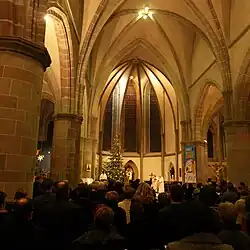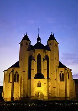 1340 wurde die romanische Kirche bei Kämpfen zwischen Herzog Rudolf von Lothringen und dem Herzog von Bar durch einen Brand zerstört. Mit dem Wiederaufbau wurde direkt nach Kriegsende begonnen: Auf Bitten Rudolfs gewährte Clemens VI. einen Ablassbrief, mit dem die notwendigen Mittel für den Wiederaufbau des Klosters gesammelt werden sollten. Der Chor wurde 1345 unter Abt Gutzon de Wiskirch vollendet. Auf dem Schlussstein im Chorgewölbe erinnert daran eine Inschrift: + CONSTR : PER :GUTZONEM : ABB DE : WISKIRCH : M : CCC - XLV.[2] Auf dem Schlussstein abgebildet ist Christus am Kreuz, daneben ein Mönch und der Abt. Das Kirchenschiff wurde noch vor dem Ende des 14. Jahrhunderts unter Gérard d’Esch (Amtszeit 1385–1413) ebenfalls wiederhergestellt, das erste Joch im südlichen Seitenschiff trägt sein Wappen. Im 15. Jahrhundert wurde die Kirche von dem Abt Arnould Wisse de Gerbéviller erweitert und weitere Gewölbejoche im Mittelschiff wieder errichtet. Das zweite Joch im Mittelschiff trägt im Schlussstein das Wappen des Abts.