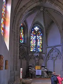 Jedes Seitenschiff besitzt eine Kapelle, die neben dem Chor liegt und ein geöffnetes Oktogon bildet. Die Seitenkapelle im Süden ist dem heiligen Petrus geweiht. Die Kirchenfenster zeigen Darstellungen der heiligen Helena, die das Kreuz in Jerusalem entdeckt, die Gründung des Klosters durch Judith und Bischof Dietrich II. von Metz. Die nördliche Seitenkapelle ist der Jungfrau und Gottesmutter Maria gewidmet und die Kirchenfenster stellen Mariä Verkündigung und ihre Himmelfahrt dar, sowie die Verkündung des Dogmas der leiblichen Aufnahme Mariens in den Himmel durch Papst Pius XII. Die Mauerflächen sind mit Blendmaßwerk verziert. In der Weihnachtszeit findet in dieser Kapelle die holzgeschnitzte Krippendarstellung ihre Aufstellung.