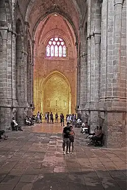 Die romanische Abteikirche bietet einen weiteren Höhepunkt zisterziensischer Baukunst. Ihre Errichtung wurde bereits gegen Ende des 12. Jahrhunderts begonnen. Sie erweist sich als höchst originelle Formulierung des bekannten Schemas. Das ursprünglich dreischiffige (älterer Teil) und fünfjochige Langhaus der Kirche begrenzt mit der Außenwand ihres nördlichen Seitenschiffs die Südgalerie des Kreuzgangs. An beiden Enden dieser Wand gibt es je einen Zugang aus dem Kloster, einer für die Mönche aus der Südostecke des Kreuzgangs in das fünfte Joch und ein zweiter aus der westlichen „Gasse der Laienbrüder“ in das erste Joch der Kirche. Das schlanke Mittelschiff wird von steil angespitzten Tonnen eingewölbt, die durch im Querschnitt rechtwinklige und scharfkantige Gurtbögen in fünf Joche unterteilt werden. Ihre Wölbungsansätze werden von kräftigen über die Kapitelle der oberen Dienste als Kämpfer hinweggeführten Kraggesimsen markiert. In dieser Höhe lehnen sich in den äußerst schlanken und hohen Seitenschiffen die Scheitel ihrer halben Tonnengewölbe, die ebenso von Gurtbögen unterteilt sind. Die Scheidewände werden durch schlanke Arkaden durchbrochen, deren angespitzte Bögen mit ihren Scheitel fast bis unter die Kraggesimse der Wölbung hinaufreichen, deren Laibungen beidseitig scharfkantige Rückversätze aufweisen. Die inneren im Querschnitt rechtwinkligen Bögen stehen auf halbrunden Diensten, die mit nicht skulptierten Kapitellen und weit ausladenden profilierten Kämpfern ausgerüstet sind. Die Gurtbögen des Mittelschiffs stehen auf halbrunden Zwillingsdiensten, die mit doppelten nicht skulptierten Kapitellen und profilierten Kämpfern in Höhe der Kraggesims ausgerüstet sind. Die Gurtbögen der Seitenschiffe stehen beidseitig auf Pfeilervorlagen mit gleichen Querschnitten. Das Kämpferprofil der Scheidewandarkaden wird um die ganzen Pfeiler und die Zwillingsdienste und Wandvorlagen herumgeführt. Die Gewölbeansätze in den Seitenschiffen werden wie beim Mittelschiff von Kragkonsolen markiert, die als Kämpfer um die Wandvorlagen herumgeführt werden. In dieser Höhe liegen auch die Bogenansätze der rundbogigen Arkaden an den östlichen Kopfenden der Seitenschiffe.
