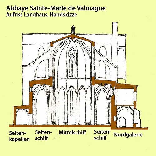 Zwanzig Jahre bevor die Gotik bei den Kathedralbauten in Südfrankreich Einzug hielt, entstand in Valmagne eine gotische Klosterkirche, die sich wie eine Kathedrale (Bischofssitz) präsentierte, auf basilikalem Grundriss in Form eines lateinischen Kreuzes errichtet, von einer stilistischen Finesse und Zartheit, die im Süden ihresgleichen sucht, das erste Beispiel nordfranzösischer Hochgotik im Languedoc.