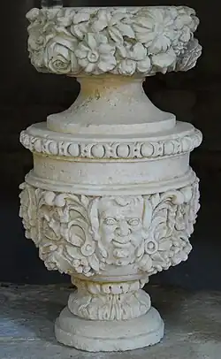 Auf den Brüstungen steht je eine aufwändig skulptierte „Vase des Kardinal de Bonzi“ aus dem 17. Jahrhundert. Zusammen mit den beiden gleichen auf der Sitzbank zwischen den Fenstern sind es insgesamt sechs Vasen.