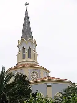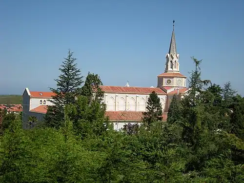 Die Fassade ist durch Bogenfenster mit Zwischenpfosten (Ajimez) und spitze Bögen bestimmt. Direkt an den Kreuzgang anschließend befindet sich die neugotische Klosterkirche, die den Grundriss eines lateinischen Kreuzes aufweist. Sie besitzt eine polygonale Apsis, die Schiffe werden nach oben durch ein Kreuzrippengewölbe abgeschlossen. Über der Vierung erhebt sich ein achteckiges Kuppelgewölbe, auf das nach außen ein Turm aufgesetzt ist. 1962 brannte der Originalturm nach einem Blitzeinschlag aus.[22]