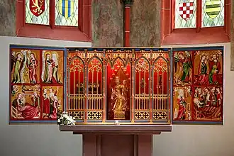 Seit 1997 steht auf dem Sandsteinaltar die Rekonstruktion des Retabels aus dem Prämonstratenserinnenkloster Altenberg bei Wetzlar. Es dient als Aufbewahrungs- und Zeigealtar für die Reliquien und stellt in seinen Bildern das Leben der Gottesmutter Maria und der hl. Elisabeth dar. Im Mittelfeld steht die Statue einer thronenden Madonna mit Kind.