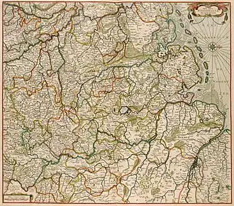 gewestete Karte des Westfälischen Kreises von Frederik de Wit (um 1690; Die Reichsabtei Werden im oberen linken Teil an der Ruhr gelegen)
