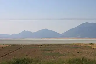 | Blick vom Nordufer auf die Beşparmak Dağları; vor dem Gebirge ist der salzverkrustete Seeboden zu erkennen. | ||