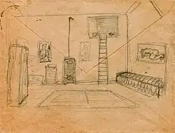 Die Vittis vermieteten auch Ateliers im selben Haus, oder zumindest ein Atelier. Ende Oktober 1906 bezog Paula Modersohn-Becker dort ein Atelier. Ob sie auch an Kursen der Akademie teilnahm, ist unklar. Auf einem Briefumschlag skizzierte sie 1906 das Atelier. Auf der linken Seite im Atelier hing das Gemälde Bildnis Lee Hoetger vor Blumengrund (Frau von Bernhard Hoetger), rechts daneben Frau mit Katze und Papagei und an der rechten Wand Liegende Mutter mit Kind II.[2] Ende März 1907 reiste sie mit Otto Modersohn zurück nach Worpswede und ließ einige Möbel und Dinge zurück.[3] Am 5. April schrieb sie an Rainer Maria Rilke, dass er das von der Einrichtung haben könne, was er haben möge, und den Rest an einen Trödelhändler verkaufen könne.[4] Scheinbar war das Interesse nicht groß oder er hatte keine Zeit, denn vier Monate später, am 10. August 1907 schrieb sie Rilke:[5]