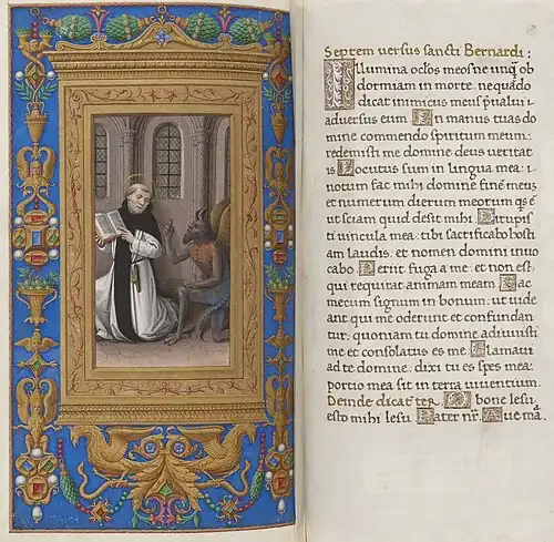 In einigen Manuskripten werden die Verse grafisch durch eine Miniatur eingeführt, die die Legende darstellt. Ein deutsches Gebetbuch aus dem Jahr 1508 zeigt einen aufmerksamen Bernhard, der auf einem Hocker am Schreibtisch sitzt, auf dem der Psalter sich befindet. Hinter dem Schreibtisch versteckt sich ein fast gleich großer schwarzer Dämon, der sich bemüht, Bernhard beim Gebet zu stören.