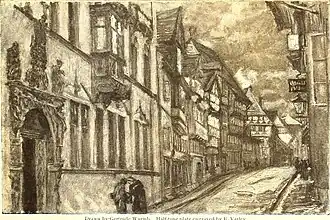 Das Patrizierhaus besaß über zwei massiv gebauten Geschossen ein überkragendes Fachwerkgeschoss. Nach einer Restaurierung im Jahre 1936 wurde das Gebäude während des Zweiten Weltkrieges beim Bombenangriff in der Nacht auf den 15. Oktober 1944 bis auf die massiven Außenwände zerstört.