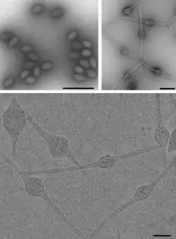 A. convivator mit ausknospenden Virionen von Acidianus two-tailed virus (Gattung Bicaudavirus, Bicaudaviridae). | ||||||||||||