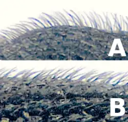 | Abb. 4: A: Behaarung am Hals- schild, B: Behaarung an den Flügeldecken, jeweils Ausschnitt, (Kopf liegt in Abb. 4 und 5 links) |