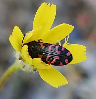 Die Flügeldecken sind etwas schmaler als der Halsschild an der breitesten Stelle. Sie tragen vier rot-orange, gezackte Querbinden, die an der Naht breit unterbrochen sind. Sie sind deutlich voneinander getrennt, höchstens die ersten beiden Querbinden können längs miteinander verbunden sein. Obenberger benennt zwölf Varianten der Flügeldeckenzeichnung und bildet zehn davon auch ab.[8] Hinter der Schulter ist eine fast glatte Längsbeule ausgebildet. Die Flügeldecken sind deutlich gestreift, die Intervalle sind flach und grob punktiert. Die Flügeldecken sind nach hinten gerichtet behaart. Der Rand der Flügeldecken ist unter den Schultern etwas ausgerandet. Hier werden die Hautflügel während des Fluges bewegt, während die an der Naht miteinander verwachsenen Flügeldecken geschlossen bleiben (Bild[9]).