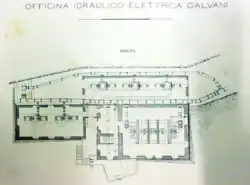 - ↑ Niccolò Bruno: L'acquedotto De Ferrari Galliera. Hoepli. Milano. 1893. Vol. 2. Annex 26 (Grundriss Kraftwerk Galvani) Wikimedia Commons