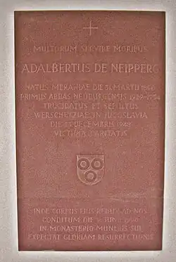 Grabplatte von 1990 im Kloster Neuburg. Die Inschrift bezeichnet ihn als VICTIMA CARITATIS („Opfer für die Liebe“)