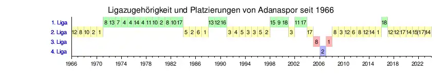 Adanaspor ist ein türkischer Fußballverein aus der südtürkischen Großstadt Adana. Der Verein spielte insgesamt 22 Jahre in der obersten türkischen Fußballklasse (Süper Lig) und belegt in der Ewigen Tabelle dieser Liga den 18. Rang.[1] Seine bisherige erfolgreichste Zeit erlebte der Verein ab Mitte der 1970er Jahre bis zu den ersten beiden Jahren der 1980er Jahre. Während dieser Zeit beendete der Verein die Liga drei Mal auf dem vierten Tabellenplatz. Die Krönung dieser erfolgreichsten Zeit erreichte der Verein in der Saison 1980/81. Hier spielte der Klub mit Trabzonspor lange Zeit um die türkische Meisterschaft mit und beendete die Saison hinter diesem als türkischer Vizemeister.