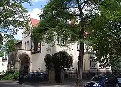 Zum Denkmalensemble gehören auch Teile des Vorgartens und Garten sowie die schmiedeeiserne Umzäunung.